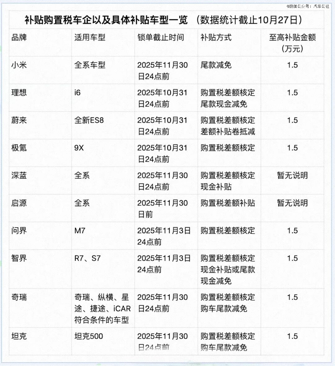 在2025年10月31日前完成锁单的订单,若因官方原因在2026年开票交付,用户可享受购置税差额补贴,补贴金额将直接从用户的车价尾款中扣除。